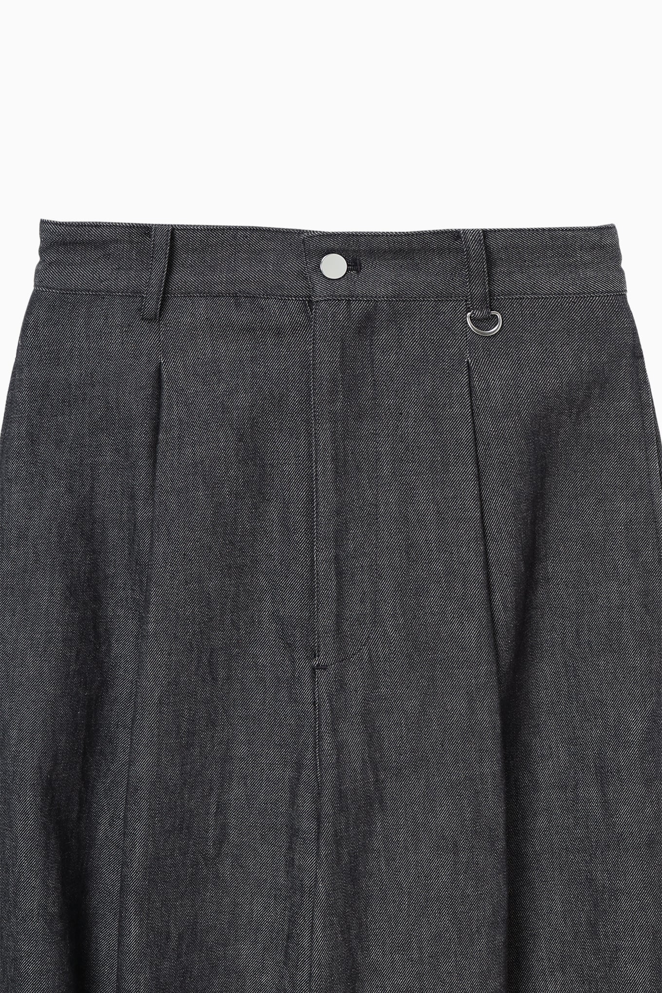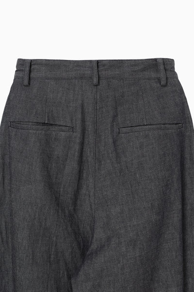 裾に施されたダーツによって作り出されるコクーンシルエットが、脚をすっきりと演出。