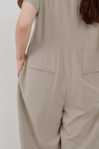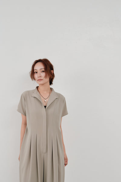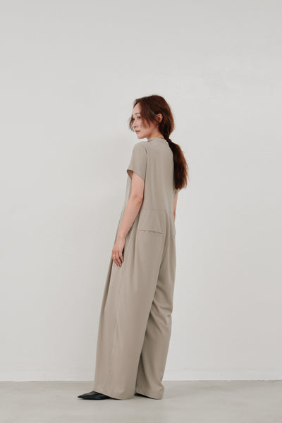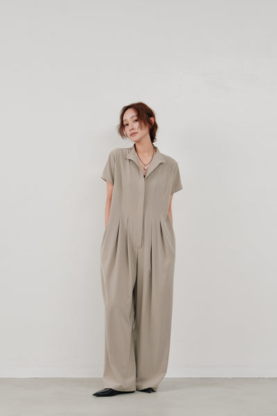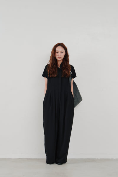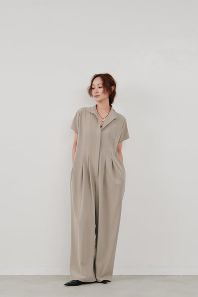 スタンドカラーが印象的な、ミニマルデザインのコンビネゾン。